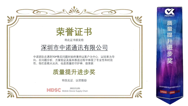 近日,2022年聯(lián)想供應商質量論壇主題分享及年度頒獎在線上拉開帷幕,福日電子成員企業(yè)深圳市中諾通訊有限公司在線上出席了此次活動。“匠家技最巧,能工事尤精”,今年中諾項目的售后返修率TCRR指標滿足目標要求并持續(xù)降低,在本次論壇中獲得多次表揚,并榮獲“聯(lián)想2022年度質量提升進步獎”。