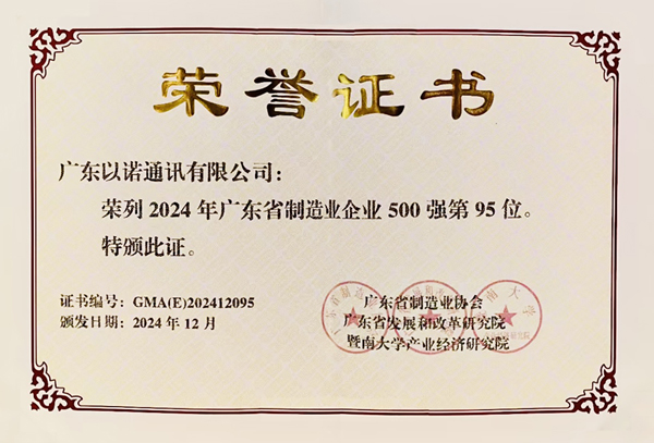 “廣東省制造業企業500強”榜單由廣東省制造業協會聯合相關機構發布,旨在貫徹落實黨的二十大精神和高質量發展要求,通過嚴格的數據采集與專家評審,全面反映廣東制造業的競爭力與發展趨勢。榜單自2013年啟動以來已連續發布12年,是政府政策制定和行業前沿研究的重要參考。以諾通訊憑借持續創新和穩健發展躋身前百強,這一榮譽是對企業技術實力和行業貢獻的高度肯定。