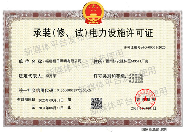 近日,福日電子成員企業福日照明順利通過國家能源局福建監管辦公室核準,成功取得承裝(修、試)電力設施許可證(三級)資質。這標志著福日照明已具備承接35kV及以下電壓等級電力設施的安裝、維修和試驗業務的全面能力,為企業進一步拓展電力工程市場提供了堅實保障。