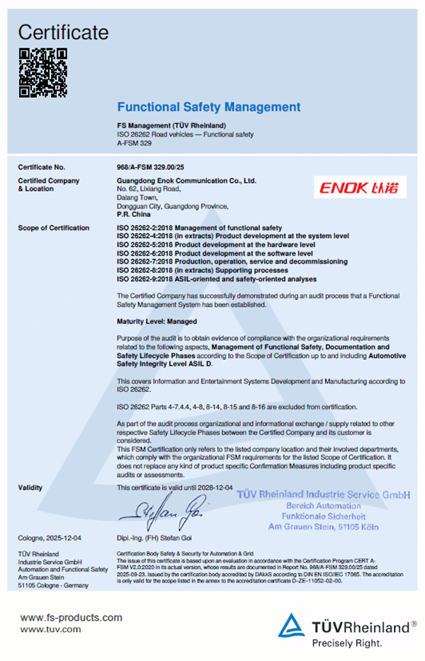 近日,國(guó)際獨(dú)立第三方檢測(cè)、檢驗(yàn)和認(rèn)證機(jī)構(gòu)德國(guó)萊茵TüV集團(tuán)(TüV Rheinland)正式向福日電子成員企業(yè)以諾通訊頒發(fā)ISO 26262:2018汽車功能安全管理體系認(rèn)證證書。該認(rèn)證確認(rèn),以諾通訊已按照汽車功能安全最高等級(jí)ASIL-D要求,建立了產(chǎn)品全生命周期的功能安全開發(fā)與管理流程體系,標(biāo)志著公司在汽車電子通訊領(lǐng)域的功能安全能力達(dá)到國(guó)際先進(jìn)水平。